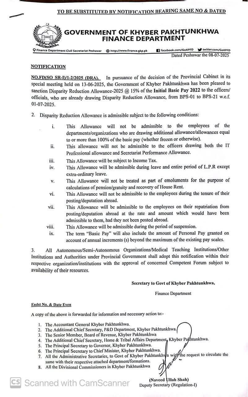 special meeting held on 13-06-2025, the Government of Khyber Pakhtunkhwa has been pleased to sanction Disparity Reduction Allowance-2025 @ 15% of the Initial Basic Pay 2022 to the officers/officials, who are already drawing Disparity Reduction Allowance, from BPS-01 to BPS-21 w.e.f. 01-07-2025.